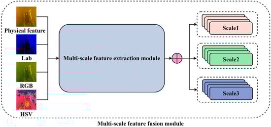 RGB color space is processed using a physical model. The output, along with data from other color spaces, is fed into a multi-scale feature extraction module. Each scale extraction block captures diverse image features, enhancing the model’s expressiveness. Distinct image features at various scales are integrated to obtain fused feature representation. (See Figure 4 and Figure 5 for visual representation).