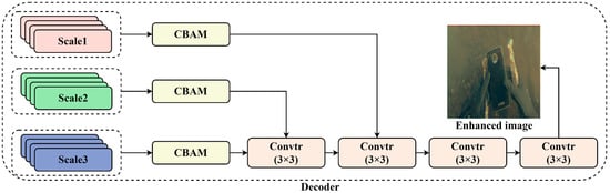 Figure 6 illustrates the fusion of features at different scales, which are then entered into the channel spatial attention module (CBAM) [18] before undergoing the decoding process. Firstly, at the stage of fusion between the physical model and deep learning features, the output of the physical model is concatenated with multi-scale features extracted from different color spaces (HSV, RGB, Lab) at various scales. At each scale, the concatenated features result in feature maps of size 256 × H × W, where H and W represent the height and width of the feature maps, respectively. Secondly, at the input attention mechanism (CBAM) stage, CBAM operations are performed on the concatenated features at each scale to enhance feature representation. Following CBAM, the size of the feature maps at each scale remains 256 × H × W. Lastly, at the up-sampling stage, spatial dimensions of the feature maps are progressively increased using transposed convolutional layers. After the first transposed convolution (convtr1), the size of the feature maps becomes 128 × 2 H × 2 W, due to the doubling of height and width. In the second transposed convolution (convtr2), the size of the feature maps is 64 × 4 H × 4 W, achieved by concatenating with fused features from the preceding scale. Similarly, after the third transposed convolution (convtr3), the size of the feature maps becomes 32 × 8 H × 8 W, and after the final transposed convolution (convtr4), the size is 16 × 16 H × 16 W. Ultimately, the fifth transposed convolution (convtr5) yields the final output with the desired number of output channels.