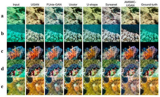 Visual results compared with other UIE methods on the EUVP dataset. Five randomly selected cases from the EUVP dataset (a–e).
