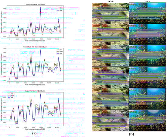 (a) Visualization curve comparing the output of AMSMC-UGAN with the RGB distributions of input and ground truth. The vertical axis is measured in , and the horizontal axis is measured in . (b) Feature point matching comparison between AMSMC-UGAN and other UIE methods, from top to bottom: AMSMC-UGAN, UGAN, FUnie-GAN, Ucolor, U-shape, SyreaNet.