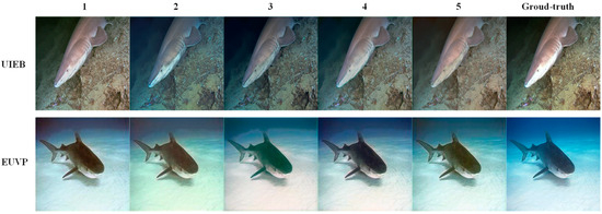 In order to evaluate the effectiveness of various key components within the network, this study conducted ablation experiments on both UIEB and EUVP, comparing the performance of each network in enhancing underwater images, as demonstrated in Figure 12.