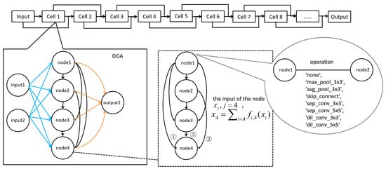 The various hyperparameters in the NAS space exploited by the DARTS algorithm represent the super network illustrated in Figure 1, where the network consists of cells, and the cells consist of nodes.