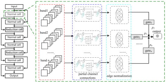 The computational complexity of the DARTS algorithm is reduced by decomposing the information from the multiple bands of remote sensing images according to the scheme illustrated in Figure 2. Not only does this reduce the dimensionality of the image, but each of the decomposed bands of the remote sensing image is processed or analyzed independently to extract relevant features or components, which reduces the training time. Comparing Figure 1 and Figure 2 indicates that the generic cells in Figure 1 are structured as normal cells and reduction cells, where a reduction cell is connected after several consecutive normal cells. With the exception of the first cell, the inputs of all remaining cells are the outputs of the two previous cells. The first cell is special because its input is specified as the images of all n bands, where n bands are input into the search network in parallel. The individual operations conducted in the first cell are illustrated in Figure 3, where the n decomposed bands are assigned partial channel connections and subjected to edge normalization.