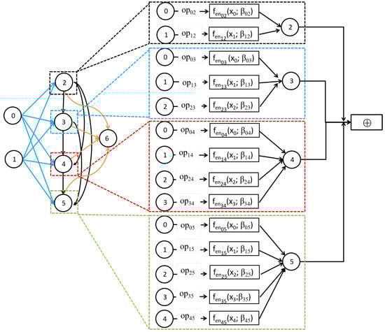 The implementation of edge normalization is illustrated in Figure 4. As can be seen, the information flow between two nodes is represented by the function , where is an architectural parameter that is applied to calculate the weight of the edge as . After the NAS process is completed, the weights of the edges of nodes in the directed graph are determined using architectural parameters and . Because the weights are shared for each operation during training, the learned parameters are less sensitive to channel sampling, which makes the network search process more stable.