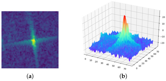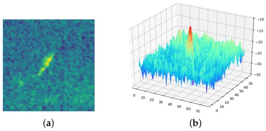 The performance of the proposed differentiable NAS method was evaluated based on its application of developing a neural network architecture to classify remote sensing images derived from the C-band radar data of the Sentinel-1 satellite mission for the east coast of Canada, which included a reasonably balanced number of image samples comprising two object classes, including ships and icebergs. The C-band radar dataset was composed of 1604 image samples in total, which were partitioned to include 1443 samples (90%) in the training dataset and 161 samples (10%) in the validation dataset. The training dataset included 726 samples of ships and 717 samples of icebergs. The reasonably balanced number of samples for these two classes was advantageous for the training process. Figure 5 shows a two-dimensional and three-dimensional display of a sample ship, and Figure 6 shows a two-dimensional and three-dimensional display of a sample iceberg.