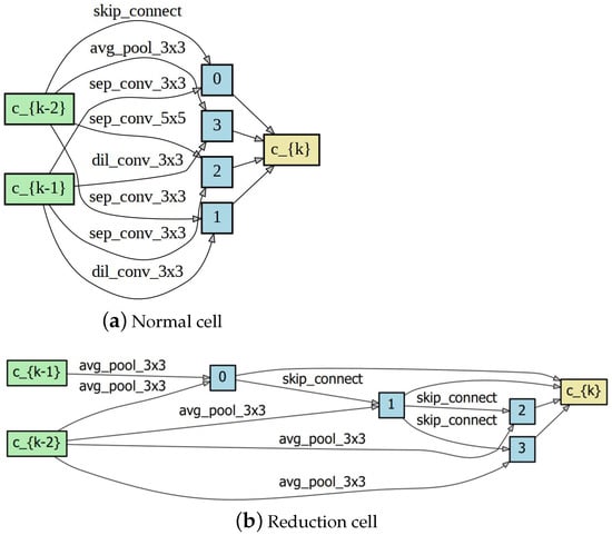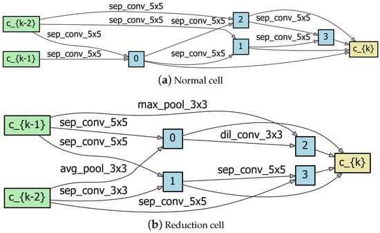 The architecture search was ordered to find the optimal cell structure and the two optimal incoming edges of each intermediate node in the directed graph shown on the left side of Figure 3. Equation (2), based on hyperparameters and , determines the weights of the edges. These operations were implemented by modifying the forward function in PyTorch to choose the best operation for these selected edges from eight candidate operations and their corresponding convolutional mask sizes, including none, max pooling (), average pooling (avg_pool_3×3), skip connections (skip_connect), separable convolution (sep_conv_3×3), sep_conv_5×5, dilated convolution (dil_conv_3×3), and dil_conv_5×5. In order to facilitate comparisons with DDSAS and DARTS, we considered using the same unit structure as them. The basic cell architecture methods considered employed seven nodes for each cell, which included two input nodes and representing the outputs of the two previous cells, one output node , and four intermediate nodes labeled 0, 1, 2, and 3. Each intermediate node had two incoming edges, representing the two operations with the highest weight values during the architecture search phase. The maximum weights were determined using , where the two largest weights were retained, and the other edges connecting to nodes were pruned. A cell has 14 edges, and one of the above-discussed eight candidate operations were applied to each edge. The normal cells and the reduction cells were stacked one after the other in the super network and shared these weights. The optimal normal and reduction cell architectures obtained by the proposed NAS method are presented in Figure 8a,b, respectively. The corresponding network architectures obtained by the DDSAS and DARTS methods are presented in Figure 9 and Figure 10, respectively.