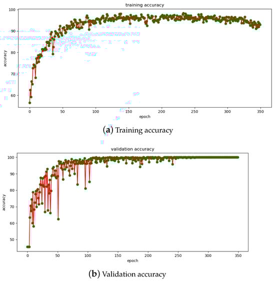 The proposed method uses the cell structure shown in Figure 8, while in [1], the manually designed method has four layers of convolutional layers and pooling layers alternately stacked, as shown in Figure 11. The classification performance of the CNN generated by the proposed method during training in Table 4 was compared with the performance of the manually designed CNN for the same dataset classification task previously proposed in [1]. The performances of the two methods regarding training accuracy are essentially equivalent, reaching 99%. The validation accuracy of the proposed method at 99.22% is 2.8% higher than the validation accuracy of 96.43% for the method described in [1]. This indicates that the network structure obtained using the architecture search method has a better generalization performance than the manually designed model in [1]. Figure 12 shows the observed classification performance of this method over 350 training epochs.