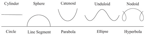 The open parts of the cylinder, sphere, catenoid, unduloid and nodoid shown here are obtained by revolving the profile curves in Figure 1 about symmetry axis taken this time in vertical position.