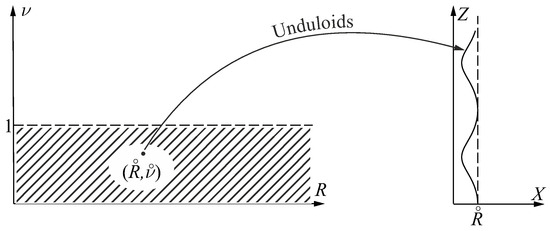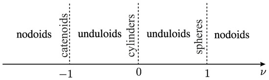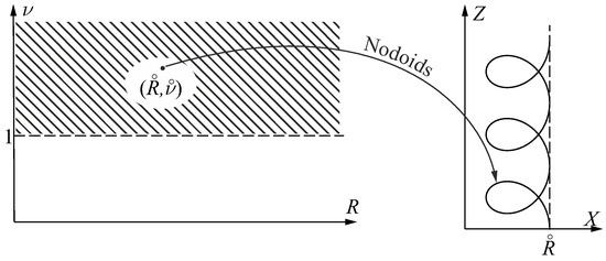 Distribution of the Delaunay surfaces specified by the chosen range of . The normal direction to the horizontal line is reserved for the first parameter R from the suggested classification of the Delaunay surfaces.