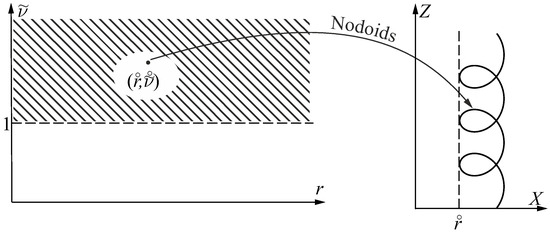 Any point in the striped region on the left hand side generates a nodoid (via Equation (30)) shown on the right hand side of the figure.