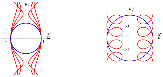 An ensemble of undularies (left) and a circle along with an ensemble of nodaries and with a different scaling the same circle (in blue) on the right.