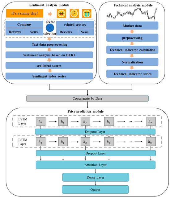 To address these issues, we propose the BERT-LLA model, which combines sentiment analysis with technical indicators. Following Li, Q. et al. [32], Nassirtoussi et al. [33], and Wang, H. et al. [34], we combine news and investor reviews for market sentiment analysis, while using financial texts from upstream and downstream industries to form multi-channel data. We also propose a comprehensive sentiment index calculation method for combining news and investor comments. We leverage the BERT model for sentiment analysis and calculate the sentiment index series and the technical indicator time series for model prediction. The main contributions of this research are: