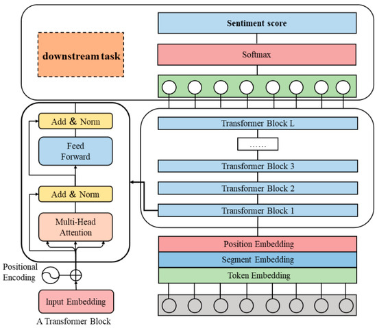 As shown in Figure 2, the sentiment analysis model based on BERT consists of multiple transformer blocks, which are used to extract features from the input vectors. For the BERT model, the model input was obtained by combining three parts: token embeddings, segment embeddings, and position embeddings. After receiving the word vectors of the input text and feeding them into BERT, the model performed two pre-training tasks: masked language modeling (MLM) and next sentence prediction (NSP). After pre-training, the BERT model can be fine-tuned for downstream tasks based on the specific requirements of the task.