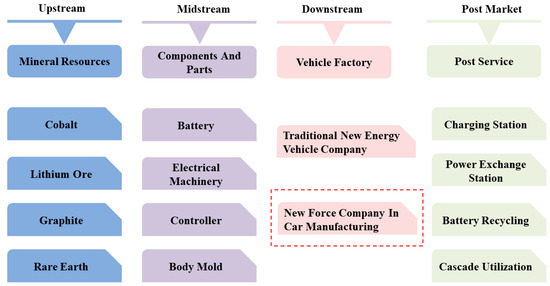 The industry chain of the new energy automobile industry. The red dashed line represents the industry of the experimental target.