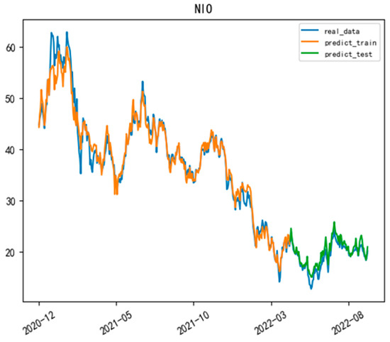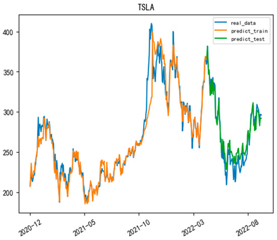 After training the model and de-normalizing the predicted results, we obtained the fitted curves of the BERT-LLA model, as shown in Figure 13 and Figure 14. It was observed that despite the significant volatility in the stock prices of NIO and Tesla, the model’s predicted values were quite close to the actual values in both the training and prediction sets.