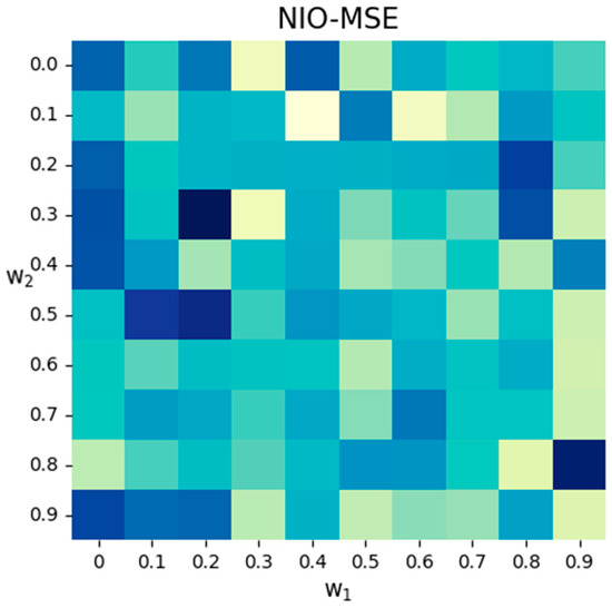 Model prediction accuracy heat map for NIO. The picture shows the distribution of the MSE under different weights and . The color intensity represents the value magnitude, with darker colors indicating larger values.
