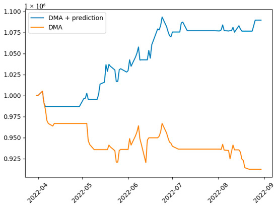 As a comparison, we used a strategy that excluded the Buy Signal 1 and Sell Signal 1, referred to as DMA (double-moving-average strategy). The effectiveness of the price prediction results for trading applications was assessed by comparing the performance of these two strategies in backtesting.