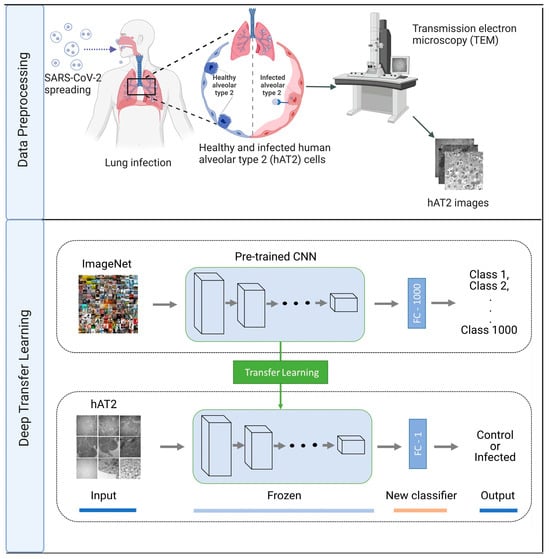 Flowchart showing our deep transfer learning approach for predicting hAT2 cells infected with SARS-CoV-2. Data preprocessing: to obtain hAT2 images, healthy and infected hAT2 images using transmission electron microscopy (TEM) imaging were downloaded and processed from https://www.ebi.ac.uk/empiar/EMPIAR-10533/ (accessed on 13 March 2023). Deep transfer learning: hAT2 images were provided to a pre-trained CNN of frozen layers for feature extraction, followed by a trained new classifier to discriminate between healthy and infected hAT2 cells. Figure created with BioRender.com.