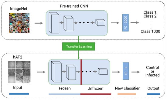 In the training phase, we employed the Adam optimizer with binary cross-entropy loss when updating the model parameters. It can be seen that transfer learning is ascribed to the unadjusted weights from pre-trained models that were previously trained on more than one million images from the ImageNet dataset. In terms of testing the performance to unseen hAT2 images, predictions are mapped to the infected if their values are greater than 0.5. Otherwise, predictions are mapped to the control.