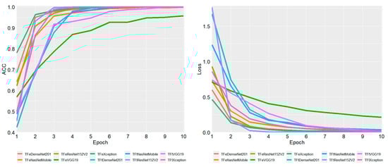 When we employed five-fold cross-validation, we divided the dataset into training and testing, in which the former had examples from four folds while the latter had examples from the remaining one fold. Then, we performed training, monitoring the accuracy and loss on the training fold. After finishing ten epochs, we recorded the loss and accuracy results, and we induced a total of ten DTL models. Then, we applied each DTL to examples in the testing fold and recorded the performance results. We repeated such a process for four more runs, recording the results, followed by taking the average loss and accuracy (see Figure 3) and reporting the average testing results and standard deviation (see Table 4). The experimental results demonstrate the feasibility of DTL in tackling the studied classification task, in which TFeDenseNet201 generated the highest average ACC of 0.993, the highest average F1 of 0.992, and the highest average MCC of 0.986.