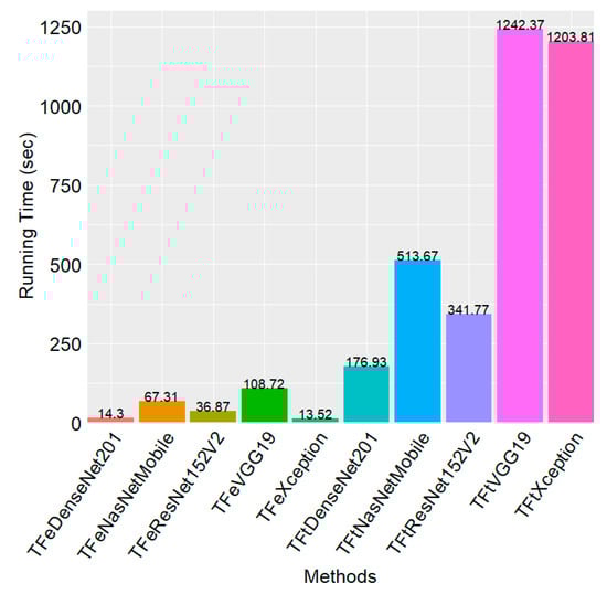 Figure 4 illustrates the total running time for each model induction process during the five-fold cross-validation. TFeXception is the fastest. Particularly, TFeXception is 89.03× faster than its counterpart, TFtXception. The second fastest method is TFeDenseNet201, which is 12.37× faster than TFtDenseNet201. The third fastest method is TFeResNet152V2, which is 9.26× faster than TFtResNet152V2. The slowest mode among the TFe-based methods is TFeVGG19, which is 11.42× faster than TFtVGG19. The running time difference between the fastest two methods, TFeXception and TFeDenseNet201, is marginal. Particularly, they differ by less than 1 s. These results demonstrate the computational efficiency of TFe-based models, attributed to fewer layers during the training phase.