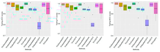 In Figure 5, boxplots demonstrate the generalization (testing) results of ten models when employing five-fold cross-validation. The median results are displayed by the horizontal bold lines crossing each box. It can be noticed that TFeDenseNet201 is the best performing model, achieving the highest median of 1.00 according to the three performance measures (i.e., ACC, F1, and MCC), where the standard deviation σ is 0.009 (0.009, and 0.017) for ACC (F1 and MCC). The second-best-performing model is TFeXception, achieving a median ACC of 0.982 (σ = 0.009), a median F1 of 0.982 (σ = 0.009), and a median MCC of 0.966 (σ = 0.017). The third-best-performing model is TFtVGG19, achieving a median ACC of 0.982 (σ = 0.017), a median F1 of 0.982 (σ = 0.018), and a median MCC of 0.966 (σ = 0.030). The worst-performing model is TFtResNet152V2, yielding a median ACC of 0.785 (σ = 0.064), a median F1 of 0.782 (σ = 0.071), and a median MCC of 0.590 (σ = 0.119). Although TFtVGG19 and TFeXception achieved the same results, the standard deviation for TFtVGG19 demonstrates greater variability in performance results, attributed to degradation in performance in two testing folds when compared to TFeXception. We report the median results in the Supplementary BoxplotMed.