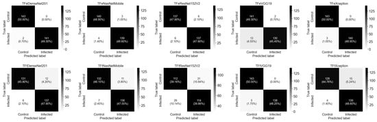 Figure 6 illustrates the combined confusion matrices of test predictions when running five-fold cross-validation. The best-performing model, TFeDeNseNet201, accurately predicted a total of 284 out of 286 hAT2 images while incorrectly predicting 2 images in which the ground truth was infected (positive) and predicted as control (negative), which counted as 2 FN. The second-best-performing model, TFeXception, accurately predicted 283 hAT2 images, while 3 images were incorrectly predicted as negative when their actual label was positive, which counted as 3 FN. TFtVGG19, the third-best-performing model, accurately predicted 281 hAT2 images and incorrectly predicted 5 as negative hAT2 images when their actual label was positive, which counted as 5 FN. The worst-performing model, TFtResNet152V2, accurately predicted 226 hAT2 images. A total of 31 hAT2 images were predicted to be positive when their label was negative, which counted as 31 FP. Moreover, 29 hAT2 images were predicted to be negative when their actual label was positive, which counted as 29 FN.