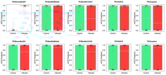 Figure 7 depicts computational insights for the generalization ability of ten studied models, applied to testing. It can be seen from the boxplots and strip charts that the prediction differences for TFeDenseNet201 between the control hAT2 against infected hAT2 were statistically significant (P < , obtained from a t-test), suggesting that the TFeDenseNet201 model is a general predictor for control or infected hAT2 prediction. The prediction differences for the second- and third-best-performing models (i.e., TFeXception and TFtVGG19) were not significant (P = 0.4838 and P = 0.1442, respectively, obtained from a t-test). These results suggest that these two models are specific rather than general predictors for hAT2. The other two models, TFeVGG19 and TFtNasNetMobile, exhibited significant prediction differences between control and infected hAT2 (P = and P = , respectively, obtained from a t-test), although their prediction performance does not outperform TFeDenseNet201. The prediction differences for all other models between control and infected hAT2 were not significant, suggesting that these models are specific predictors, and we included their p-values in the Supplementary BoxStripPval.