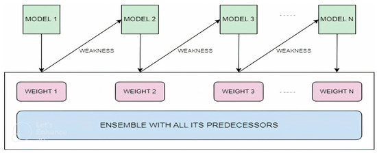 AdaBoost is a meta-estimator that works by initially fitting a classifier on the original dataset, where each data instance has an equal weight [40]. Then, it fits more copies of the classifier on the same dataset while increasing the weights of inaccurately classified instances and decreasing the weights of correctly classified instances, thus enabling subsequent classifiers to concentrate more on complicated cases. This process continues for a defined number of iterations or until the desired results are obtained. This can be understood by Figure 2. By default, the estimator used by AdaBoost is a DT with one split-level, also called a decision stump (DS) [41,42]. The pseudocode of AdaBoost is presented in Algorithm 1. The detailed explanation of the AdaBoost algorithm is given through the following points: