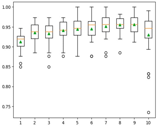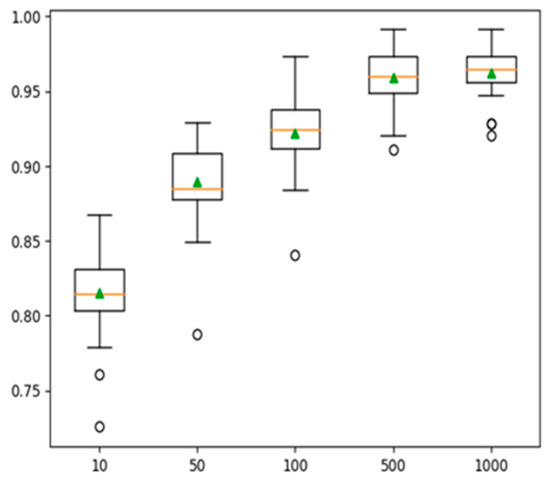 Boxplot depicting accuracies on a varying number of DTs.