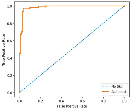 The DS focuses more on misclassified data points in the new dataset created from the samples with new weights. The process is continued for a selected number of iterations or until the desired results are acquired [43]. The training process included fitting the AdaBoost model to the training dataset using a few selected hyperparameters, including the number of decision trees (n_estimators), the maximum depth of the decision trees (max_depth), and the learning rate (learning_rate). Initially, the model was trained on the default values of these hyperparameters, which were later fine-tuned to achieve better results. The best hyperparameter values were identified using grid search cross-validation, in which various combinations of hyperparameter values are systematically explored to finalize the optimum values.