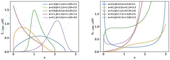 where the parameters , , and k are positive, characterizing the scale, shape, and concentration of the distribution. The function denotes the baseline pdf, represents the cdf associated with the baseline distribution, and is defined as the survival function. This formulation encapsulates the intricate relationship between the proposed L-EOR–G distribution and its underlying baseline distribution, emphasizing the adaptability and comprehensive nature of the L-EOR–G model in capturing various statistical phenomena. Our objective is to demonstrate that the incorporation of extra parameters can enhance simple distributions, originally characterized by limited variability, enabling them to exhibit a diverse array of shapes and skewness. For practical applications, utilizing this newly developed family of distributions, we advocate the selection of baseline functions with straightforward formats.