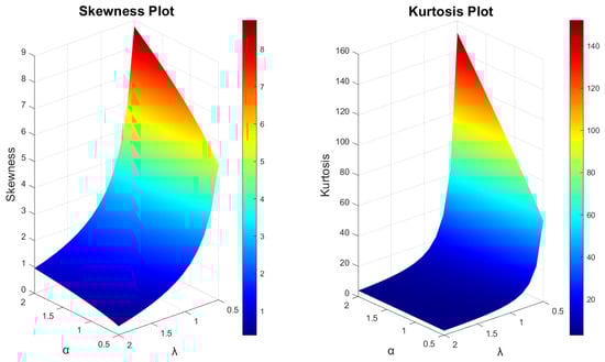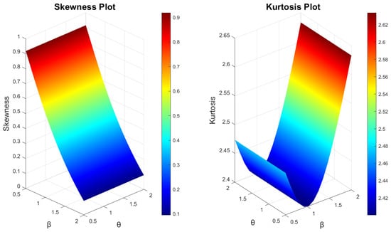 Figure 7 presents the pdf for various configurations of the L-EOR–W distribution, including a wide range of curve characteristics from left- and right-skewed to nearly symmetrical and declining profiles. Notably, the pdf illustrates a distinct stretched M shape featuring dual peaks. Correspondingly, the hrf for these distributions unveils a variety of shapes, including different forms of U-shaped, inverted U-shaped, and concave-upward trends. Further detailing the distribution’s adaptability, Figure 8 and Figure 9 explore the skewness and kurtosis across assorted parameter settings for the L-EOR–W distribution, showcasing its shape versatility under varying conditions. Diverse skewness and kurtosis plots indicate that the L-EOR–W distributions can have different symmetry and tail characteristics.