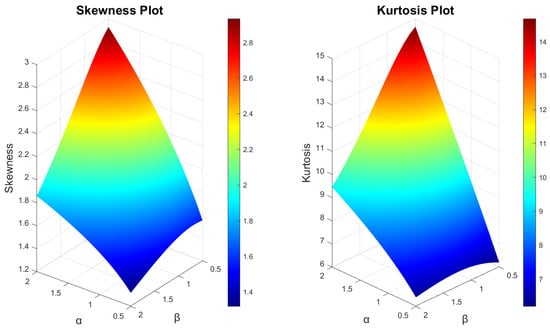 Figure 1 displays the pdf and hrf visualizations for the L-EOR–U distribution, showing a diverse array of curve shapes including monotonically decreasing trends, as well as left- and right-skewed, and various bell-shaped patterns. In parallel, the hrf of the L-EOR–U distribution illustrates a spectrum of growth trends including consistent increases and distinct bathtub profiles, emphasizing the model’s versatility. Further demonstrating this flexibility, Figure 2 and Figure 3 present the skewness and kurtosis across different parameter settings for the L-EOR–U distribution, highlighting the broad adaptability and shape variability of this model. The skewness plots show that the distributions can be left or right skew and the kurtosis plot shows that the peak and tails can have various shapes.