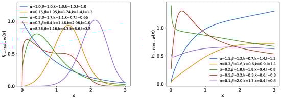 This section is dedicated to examining several special cases within the Lomax- exponentiated odds ratio–G framework, emphasizing its flexibility and adaptability across various distributions. Through this exploration, we aim to highlight the versatility of the L-EOR–G model by using different baseline distributions. For each distinct case, we present plots of its probability density function, hazard rate function, as well as its skewness and kurtosis for chosen parameters. Further visualizations of skewness and kurtosis for these cases are provided in the Supplementary Information.