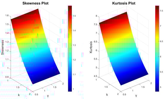 Skewness and kurtosis plots for the L-EOR–W distribution. The parameters k and are varied, while keeping , , and .