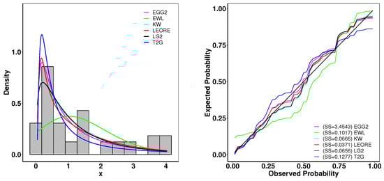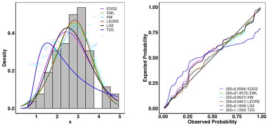 This section examines the breaking strength data of carbon fibers, each with a length of 50 mm, based on a study with a sample size of , as detailed by Nichols et al. [26]. We present a detailed comparison of parameter estimates and goodness-of-fit statistics in Table 2. Furthermore, Figure 14 displays the empirical distribution of the observed data alongside the estimated density functions of several fitted models. Among these, the LEORE distribution emerges as the superior fit for this dataset, evidenced by its exemplary goodness-of-fit statistics and the most favorable K-S test p-value, as tabulated in Table 2.