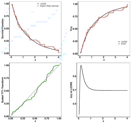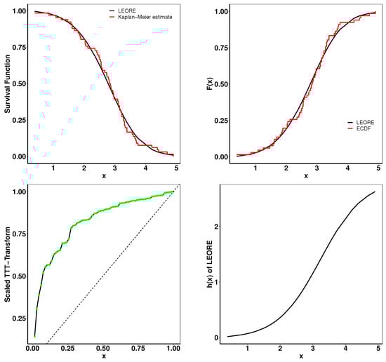 Additionally, a set of illustrative plots—including the K-M survival curve, both TCDF and ECDF, and the TTT plot—are presented in Figure 17. The remarkable alignment between empirical data and theoretical predictions reinforces the LEORE model’s accuracy in fitting the data. The TTT plot, in particular, suggests the model’s proficiency in delineating a monotonic hazard rate structure, further confirming its applicability.