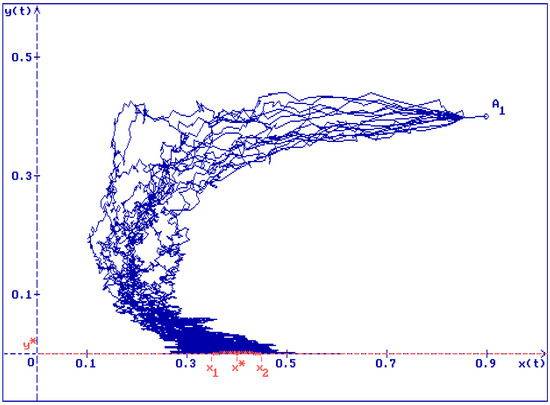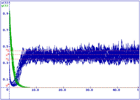 10], as well as the results obtained, can still be of certain interest. In particular, the authors show that, for this model, for small initial population sizes and for comparatively small perturbations, for a vast majority of time one of the populations remains very small, but, at the same time, never comes closer than exponentially close to zero. (That is, the system is weakly persistent.) At the same time, due to its structural instability, for large initial population sizes, the model is hardly suitable, because it leads to ever-increasing fluctuations in population sizes.