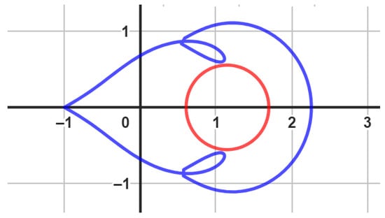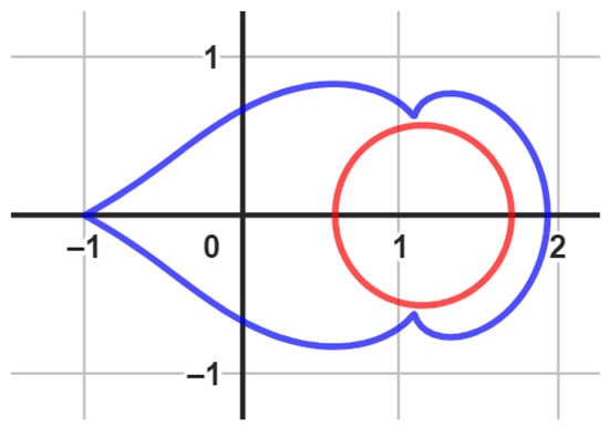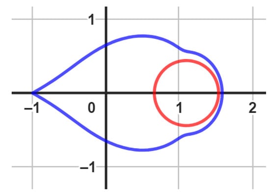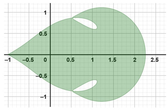 The unit disk is mapped onto a leaf-shaped region via the analytic and univalent function Ω ( ζ ) . With regard to the real axis, it is symmetric. The function Ω ( ζ ) satisfies Ω ( 0 ) = q ̧ Ω ( 0 ) = 1 and has a positive real part. Figure 2 was generated using Geogebra computer software.