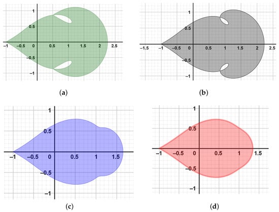 Figure 2. The figure illustrates the leaf-shaped region Ω ( U ̧ ) , which is bounded and symmetric with respect to the real axis. (a) depicts the image of Ω ( U ̧ ) in green color, with q ̧ approaches 1 ; (b) displays the image of Ω ( U ̧ ) in gray color, with q ̧ = 0.98 ; (c) shows the image of Ω ( U ̧ ) in blue color, with q ̧ = 0.5 ; (d) illustrates the image of Ω ( U ̧ ) in red color as q ̧ approaches 0 + .