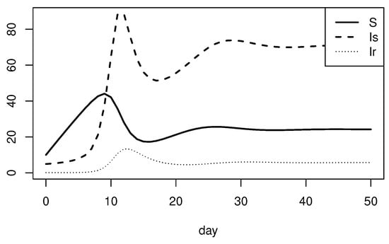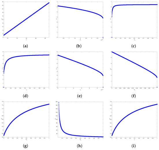 Equilibrium analysis is employed to observe the relationship between the parameters and the drug-resistant parasites in this paper. Calculating the interior equilibrium of the dynamical system is a necessary step, then we primarily focus on the part of in the equilibrium. Equilibrium analysis results are obtained in Figure 3. The results show a strong positive linearity between and as varies in the interval (Figure 3a), indicating the more merozoites were produced, the higher the value of was. As the parameters and increase, exhibits the tendency of decreasing and increasing, respectively (Figure 3b,c), but in general, their impact on is not obvious, such that their effective intervals are much smaller. The trends of (rising) and (falling) on are opposite, which exactly shows the importance of competition, that drug-resistant parasites could be controlled by competition to some extent, and the resistant parasites could not be suppressed once they obtain a strong competitive ability. Moreover, the results of the upward tendency of and just coincide with the research of Hansen [16] that aggressive treatment (a high level drug concentration) can fail and threaten patient health and lifespan. reduces with the increasing and ; the reason is obvious: that , as the decay rate of drug-resistant parasites, will inevitably lead to the reduction of with its increasing. The rising death rate of uninfected RBCs indicates the reduction of the resources of drug-resistant parasites, thereby leading to their decreasing. Therefore, on the contrary, , as the production rate of uninfected RBCs, has a positive effect on . In addition, the negative linear relationship between p and demonstrated that the gene stability can affect to a great extent.