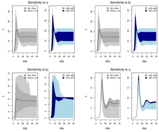 Global sensitivity analysis, on the other hand, excels in addressing this limitation by considering interactions among input parameters and varying all of them simultaneously within a certain range for epidemiological models. In contrast to LSA, GSA highlights the importance of , possibly due to its strong interactions with other parameters. Additionally, maintains the highest sensitivity throughout the analysis, suggesting that drug therapy indirectly induces changes in the population of resistant parasites, potentially through competition dynamics. The implementation of aggressive treatment could trigger competitive release of drug-resistant parasites, as sensitive strains diminish. Hence, the competitive aspect should not be underestimated, and enhancing competition between the two strains may offer a viable approach to controlling drug-resistant parasites. The temporal variation in the sensitivity of state variables to parameters is a valuable aspect of infectious disease modeling studies [39]. Notably, the sensitivity of declines around the 40th day, possibly resulting from the elimination of drug-sensitive parasites by treatment, leaving fewer sensitive parasites to make a diminishing contribution. Parameters p, , , and continue to play a similarly crucial role compared to the LSA and maintain a high level of sensitivity throughout the simulation period.