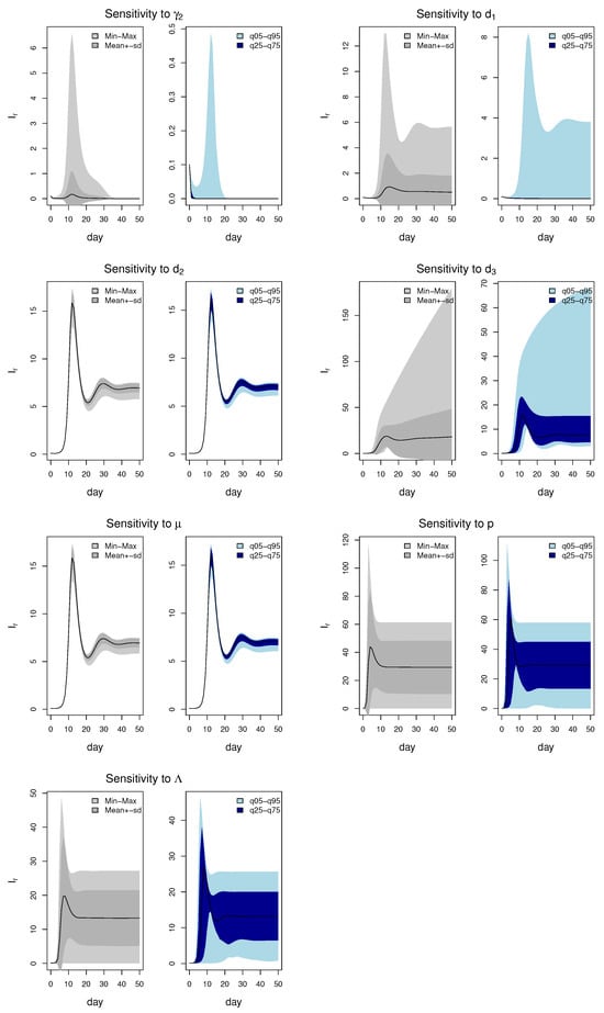 Local sensitivity of state variable (drug-resistant parasites) on all parameters. The light grey region represents from the minimum value to the maximum value; the dark grey region is from the mean value minus the standard deviation to the mean value plus the standard deviation. The light blue region ranges from the 5th percentile to the 95th percentile; the dark blue region ranges from the 25th percentile to the 75th percentile.