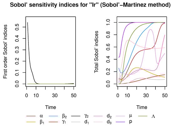 When the sensitivity index for an output variable is examined over the time course of the simulation, the relative importance of the parameters is shown to vary widely depending on the time point of inspection. The global sensitivity analysis results were obtained by employing the Sobol method, which provided a factor-based decomposition of the output variance. The first-order indices only account for the direct contribution of each parameter. The total Sobol indices quantified the fraction of the variance to explain the variability of each parameter full consideration of their interaction effects. Figure 6 depicts the first-order Sobol indices and the total Sobol indices; both of them range from 0 to 1 for all parameters. The first-order Sobol index of is high in the first few days, but then decreases sharply, and other parameters remain zero in the concerned time course. The total Sobol index of is high during the time interval, and p, , , , , and increase to a high value with time varying, indicating their relative importance to the drug-resistant strains. The other remaining parameters including , , and are relatively less sensitive to resistant strains. Combining the two figures, we could deduce that, between those parameters, an interaction may exist.