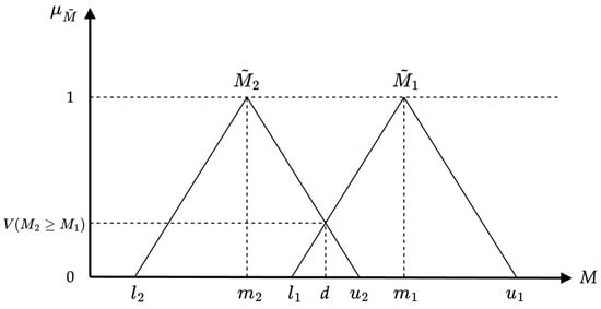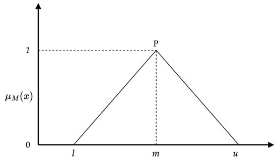 To handle ambiguous, imprecise, or uncertain real-world data, Lotfi Zadeh created fuzzy logic in 1965 []. Conventional binary logic systems could not process this information. By creating a fuzzy set and giving each object a continuous membership grade, Zadeh made it possible to reason in a more sophisticated way. A tilde (~) is used in the mathematical representation of fuzzy sets to signify continuity and flexibility. A triangular fuzzy number (TFN), as shown in Figure 1, is employed to denote a comprehensive fuzzy occurrence. A TFN is represented by the notation P = (l, m, n). The minimum and maximum possible values that characterize a complete fuzzy event are denoted by the parameters l, m, and n, respectively []. The membership function, denoted as is defined by Equation (1).
