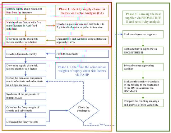 Consequently, a three-stage hybrid model combining statistical methods and MCDM approaches was developed for supplier evaluation to address the problem’s complexity. The first stage was to gather elements from the literature and interview five industry experts. Afterward, a comprehensive survey was conducted among 397 purchasing managers operating in the agri-food sector in Thailand to identify the precise components and sub-components that might influence the sustainability of supply chain supplier selection. Those risk variables were then categorized using factor analysis. In the second phase, FAHP was utilized to ascertain the weights and ranks of the sub-factors and factors of sustainability supply chain risk by considering the equivocal and uncertain decision-making environment. Subsequently, PROMETHEE II was suggested as a means of determining which supplier’s solution is most suitable for a practical implementation from among multiple candidates. Finally, the influence of the DM’s preferences for a major impact on the ranking that was received was investigated through sensitivity analysis using the Hybrid Sensitivity–Optimization Method for Agri-food Supplier Selection (HSOMASS).