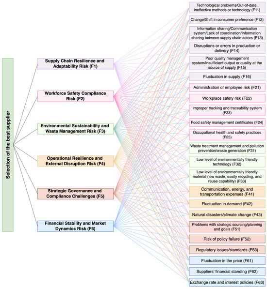 As the process of market globalization accelerates, organizations must attract additional clients by considering several characteristics such as reliability, flexibility, and quality. The suppliers in an inbound supply chain perform a vital part in determining the operational and financial positions of a business [], particularly for the agricultural items that require special consideration. The crucial links in the supply chain for agricultural products are the suppliers of those products. The goal is to ensure the quantity and quality of fresh commodities, as well as adequate cold storage to maintain quality until the raw materials are packaged or processed []. Supplier selection problems comprise a diverse range of objectives that frequently encounter conflicts. In practice, determining the performance of prospective suppliers requires a set of criteria, including but not limited to cost, quality, organizational parameters, capabilities, and other customer-defined criteria that are presently in use, to identify the optimal supplier from a range of alternatives. Nevertheless, there has been limited attention given to the incorporation of risk criteria, specifically within the agricultural sector []. However, the significance of each element varies greatly and typically relies on the nature of the product or service to be obtained []. Finding the right suppliers and focusing on critical risk factors is becoming harder since every firm has unique plans, capabilities, and scopes that must be considered throughout the selection process []. In addition, all organizations have limited funds and resources to research and consider all possible risks [].