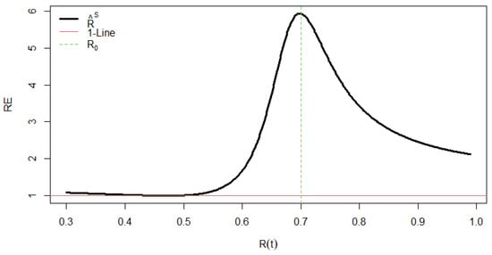 Figure 4 and Figure 5 represent the relative efficiency of PT and S estimators in the exponential model with known . Again, we can see that the PT estimator has a better performance when the parameter values are close to the true value of close to and as we move away from that point, its performance deteriorates quickly. On the other hand, the Stein-type estimator has a much larger range where it performs better than the unrestricted MLE estimator.