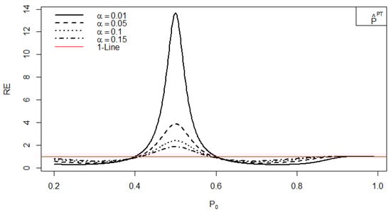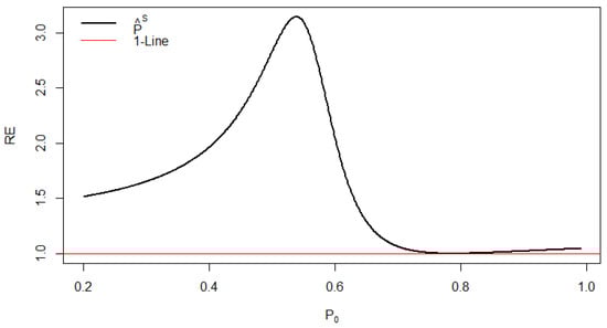 Figure 1 and Figure 2 display plots of the relative efficiency expressions above for the exponential model with . Based on these figures, the PT estimator has better performance near , while such performance deteriorates as we move away from this . While the S estimator becomes worse than the MLE, away from the point 0.7, the PT estimator has a wider range where it outperforms the MLE and away fro , it converges to the MLE from above. This means that the S estimator dominates the MLE, uniformly, in terms of MSE.